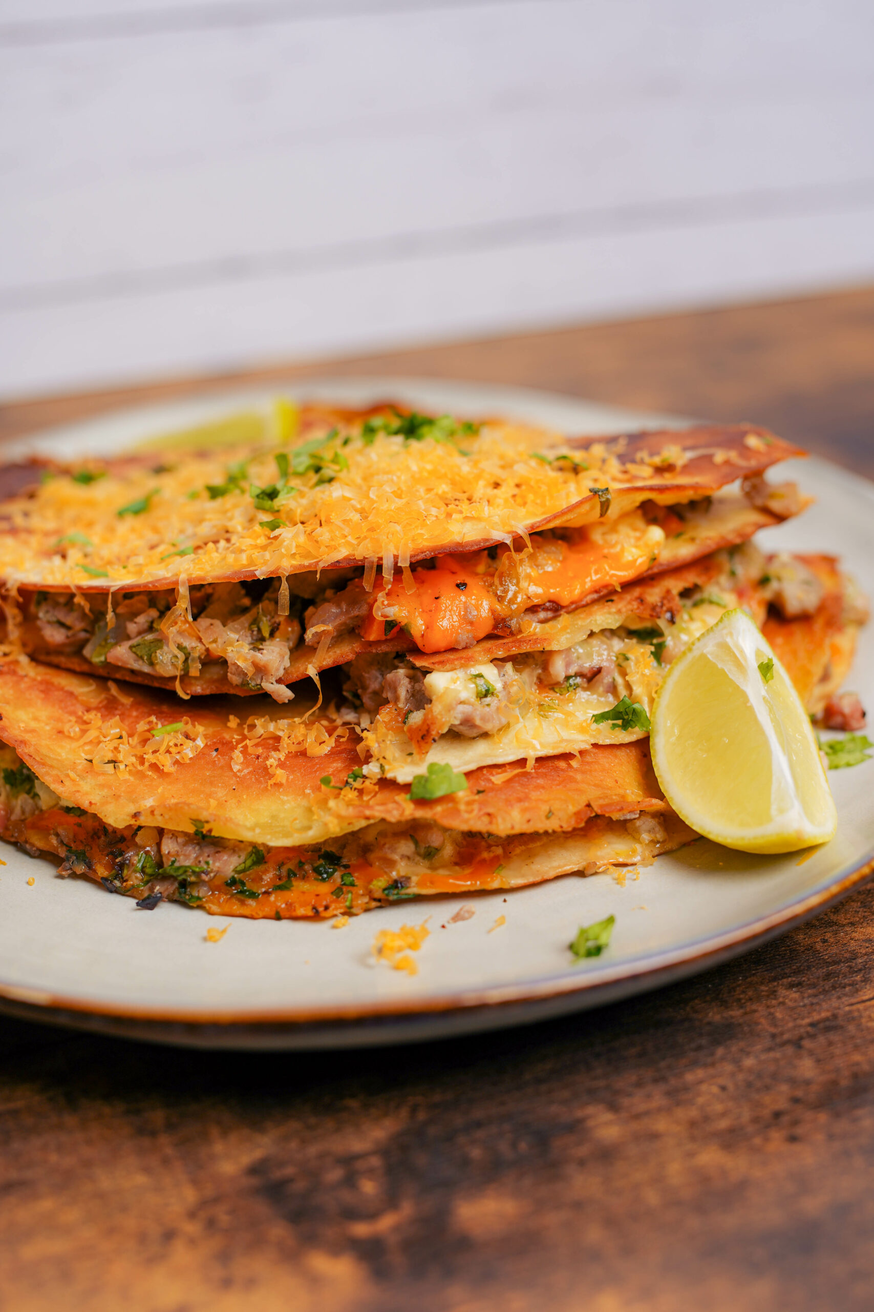 Quesadilla de veau façon normande, aux fromages, bacon, coriandre et citron vert